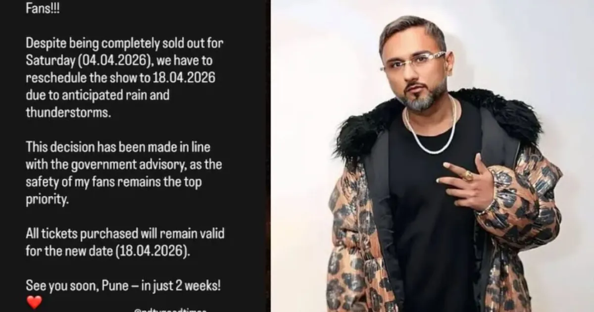 Yo Yo Honey Singh’s fans in Pune will have to wait a little longer to see him live. The rapper’s concert, originally scheduled for April 4, 2026, at Mahalaxmi Lawns, has been postponed to April 18, 2026, due to forecasts of rain and thunderstorms. The decision prioritizes the safety of fans, following a government weather advisory.