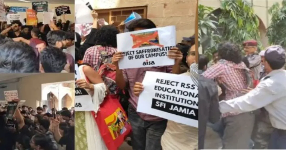Students at Jamia Millia Islamia staged protests on Tuesday against a “Yuva Kumbh” programme organised on campus to mark 100 years of the Rashtriya Swayamsevak Sangh (RSS). The demonstration drew participation from multiple student groups, while heavy police deployment was reported outside the university premises to maintain order.